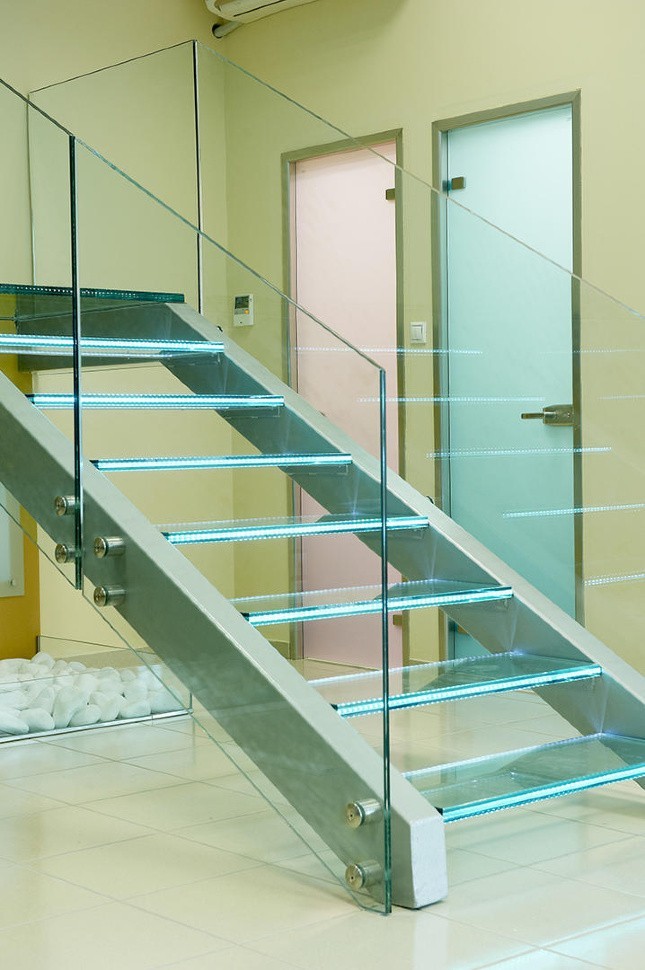 Стеклянные ступени на косоурной лестнице в доме в Омске. Готовые проекты ПерилаГлавСнаб - фото 1
